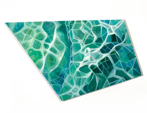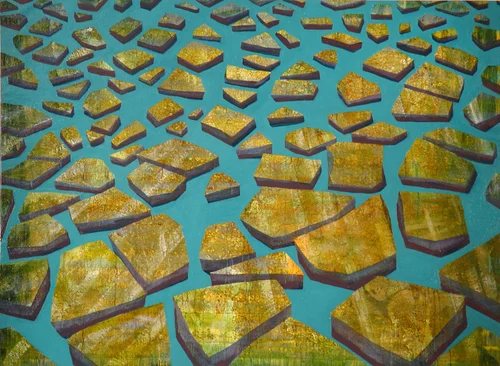 In Cracked Prospects, figures of the picturesque -- the remote landscape, the broad vista, moments of luminous transparency -- are broken and abstracted. Ice is imagined as an organization of grids, structures undermined from below or within by melt and movement. The watercolors in Subglacial present the emblematic image of a polar ice shelf as interlocking grids, rigid structures undermined by melt and movement. In Melt Marine, thick chunks of ice or land are floating into or out of the picture plane. With both the large oil paintings on canvas and small studies on panels, oil glazes are layered over screen prints of maps of a glacier.