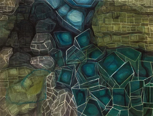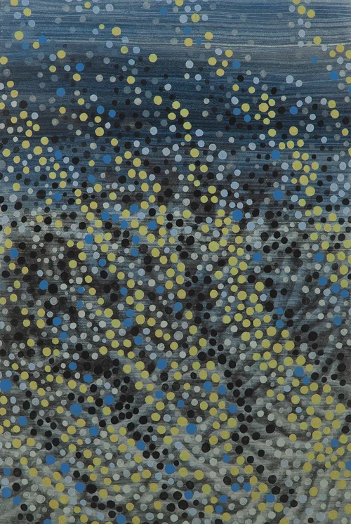 In Multigrid and the Grotto series, crystalline forms and patterns are layered on paper, panels and wall drawings. The study of minerals and geology opened a pathway into abstraction.