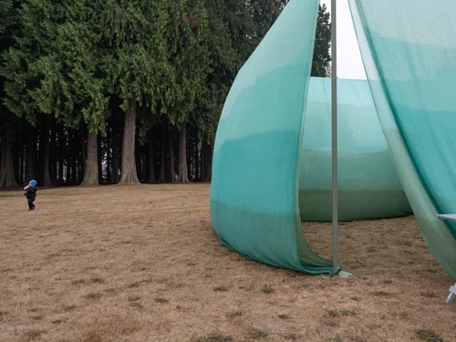 For most of my career, my work in painting and drawing has been exploring environmental and geological change. I never expected to make a large environmental art piece, until I learned about “Surge,” an upcoming exhibition at the Museum of Northwest Art in 2015. My collaborator, the designer and artist Heidi Epstein, and I originally conceived of the environmental installation, Living with Water, as a long wall of translucent green fabric. We wanted to insert a flood-level line in the landscape -- an agricultural field or parking lot or backyard where floods of that depth are predicted– in the Skagit river delta where we live. The idea was to put an abstraction, the level of water predicted in a major flood event, into real space.