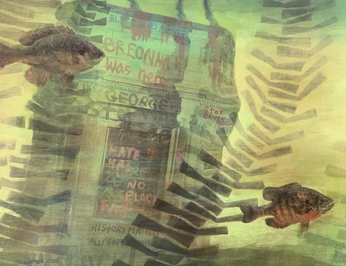 In Swamp/Garden I painted swampy, underwater scenes with Confederate monuments, guns, junked appliances, car parts, treating the swamp as a place where unwanted or shameful things can be pushed out of view. But, swimming over and growing through these objects, the plants, trees, fish, and turtles of the paintings tell the story of an ecosystem that feeds on and gives life.